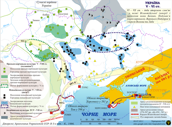 В 1-й половине VI в. начинается переселение славян (носителей пражско-корчакской культуры) в Среднее Приднепровье и ассимиляция пеньковцев (антов) славянами. Через какое-то время в этом ареале доминирует пражская керамика (луки-райковецкой культуры) и славянские полуземлянки с печами-каменками[15]. Несмотря на то что ассимилированные анты говорили уже на славянском языке, они всё ещё могли отличаться от славян традициями, одеждой и т. д.[18]. После 602 г. сведения об антах исчезают[19].