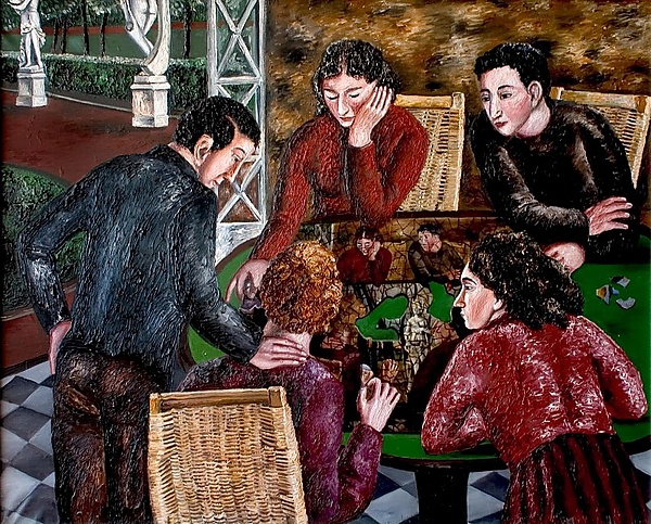 На картине изображены пятеро человек — женщина, двое мужчин и двое детей, которые сидят за большим столом и вместе собирают мозаичную картинку. Композиция построена таким образом, что группа расположена в центре, а в левом верхнем углу виден уголок парка с двумя скульптурами. Сцена отражает повседневную жизнь и характерна для бытового жанра.