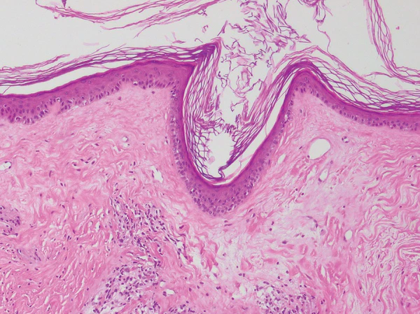 Гистологическое исследование биопсийного материала кожи выявляет характерные изменения. К ним относятся гиперкератоз, акантоз, вакуольная дистрофия клеток эпидермиса, дегенерация базального слоя, утолщение и гиалинизация дермы, снижение содержания эластических волокон, гомогенизация коллагеновых волокон, расширение кровеносных сосудов и наличие лентовидного лимфогистиоцитарного инфильтрата[1][4].