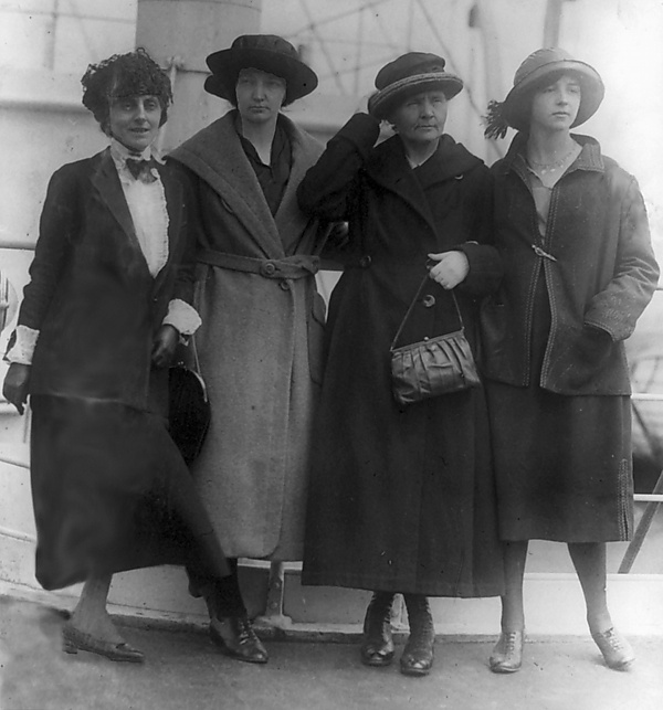 Весной 1920 года в парижской лаборатории американская журналистка Мэри Мэлони договорилась с Марией Кюри о её первом визите в США для чтения лекций[140]. Интерес Марии к этой поездке состоял в возможности получения дополнительного радия для своих работ. Стоимость 1 грамма радия в то время составляла 100 000 долларов[122]. Мэлони пообещала Марии собрать нужные средства через созданный ею «Фонд радия имени Марии Кюри» менее, чем за 1 год[141]. В мае 1921 года вместе с дочерьми Склодовская-Кюри посетила США, впервые переплыв Атлантику на пароходе. 20 мая она приняла в дар от президента Гардинга от имени американских женщин 1 грамм радия для продолжения опытов[115][141][118]. На церемонии вручался не собственно образец радия, а ключ от контейнера и сертификат качества[142][143]. Образец радия был изготовлен в лаборатории Standard Chemical Company в Питтсбурге, которую Мария посетила в ходе своего визита[141]. Во время поездки ей повредили кисть руки многочисленными крепкими рукопожатиями, поэтому часть наград Ирен принимала без участия матери[118][132][144].