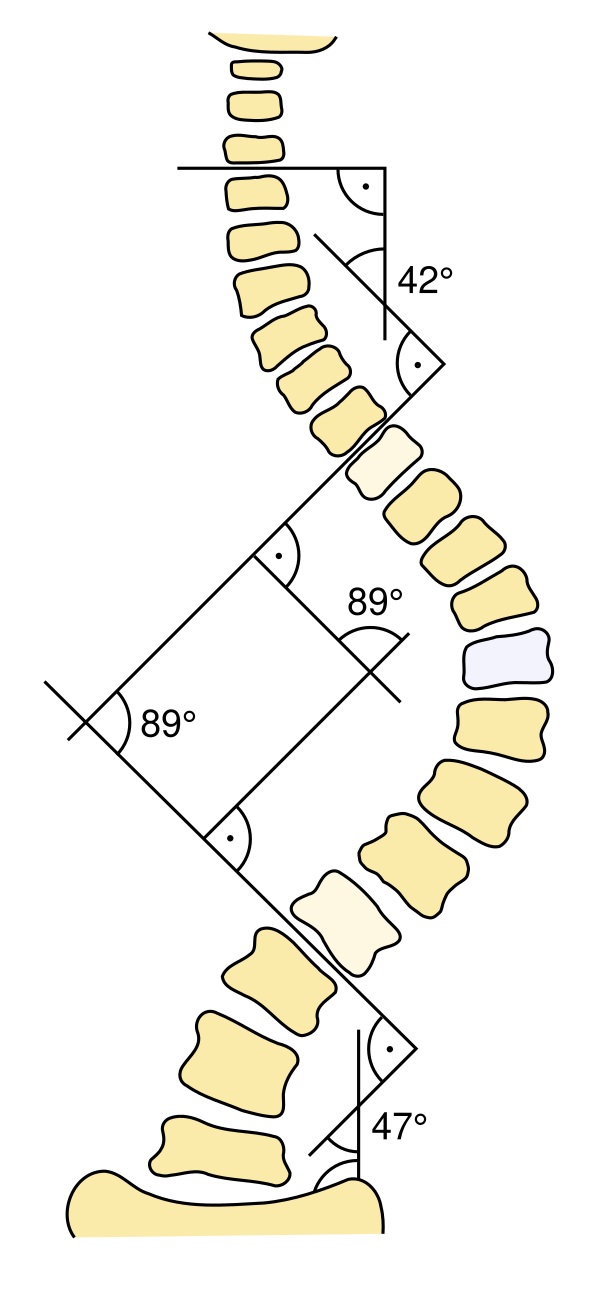 Схема анализа рентгеновского снимка для определения угла искривления разработана американским ортопедом Дж. Коббом (англ. John Robert Cobb). Угол искривления, измеренный по рентгеновским снимкам называется «углом по Коббу». Для определения угла деформации на передне-задней рентгенограмме проводят две линии, параллельных замыкательным пластинкам нейтральных позвонков. В точке пересечения этих линий измеряют угол сколиоза.