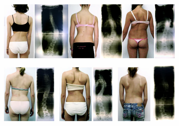 В ранних стадиях искривления выявляются лучше всего тестом «в наклоне». При этом пациент наклоняется вперёд со свободно опущенными руками. Проверяющий смотрит сзади на позвоночник и отмечает асимметрию — выступающее ребро, возвышающиеся с одной стороны ребра или лопатку, искривления позвоночника. Величина искривления позвоночника измеряется с помощью рентгеновского снимка всего позвоночника стоя. Возможны и врождённые рёберные деформации и деформации тел позвонков. С помощью этой информации можно отличить идиопатический и врождённый сколиоз. На рентгеновском снимке в боковой проекции можно также определить, есть ли врождённые деформации в этой плоскости или нарушения нормальных изгибов позвоночника — физиологических кифозов и лордозов.