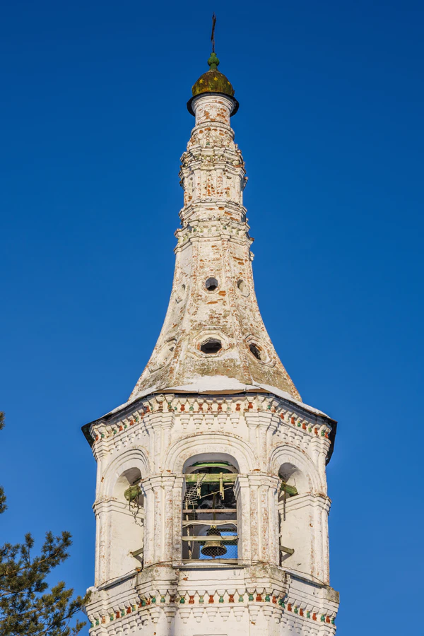 Колокольня с суздальским шатром-«дудкой»[5], имеет некоторое сходство с колокольней Никольской церкви. Для декорации её фасадов использованы неглубокие четырёх- и восьмиугольные ниши, зубчатые карнизы и майоликовые балясины.