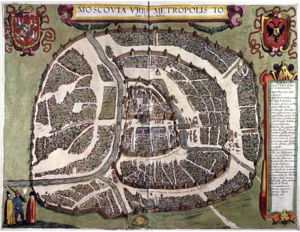 Москва или Московия, столичный город Белой России или великого княжества Московии, по величине своей ещё Ботером[7] отнесённая к четырём крупнейшим городам Европы, — после Константинополя, Парижа, Лиссабона — четвёртый; разделяется на четыре части. Первая, внутренняя — Китай-город, вторая — Белгород, каждая окружена своей стеной; третья — Скородум; четвёртая — Стрелецкая слобода; все они обнесены валом, или Полянкой, — из брёвен, засыпанных землёй; с прекраснейшими башнями. ...