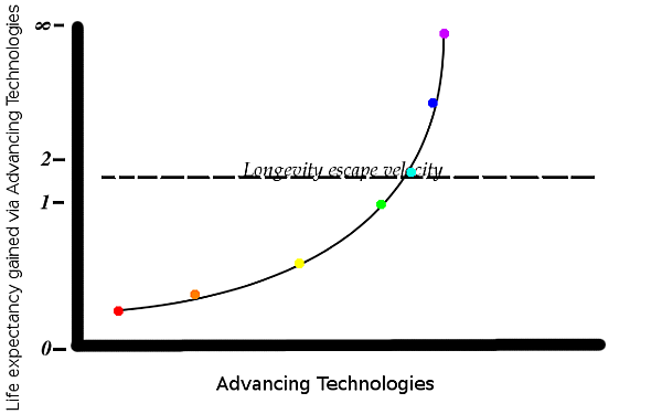 В 2019 году средняя продолжительность жизни в мире, по данным ВОЗ, составила 73.3 года, а во многих отдельных странах 80-85 лет.[4]. Чтобы совершить такой прогресс, человечеству потребовалось несколько тысячелетий. Однако большая часть прогресса была достигнута только за последние 100 лет.[5] По мере развития человечества скорость, с которой люди удлиняют свою жизнь, увеличивается. Но и в нынешнем мире эта скорость по-прежнему значительно ниже, чем скорость старения, и люди по-прежнему неуклонно продолжают умирать от старости. По мнению имморталистов, скорость убегания от старости есть ситуация, когда скорость разработки технологий продления жизни и скорость старения выровняются. После чего они ожидают появление технологий, позволяющих возвращать тела людей в более молодое состояние (включая нейропластичность).