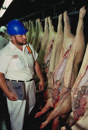 Ветеринарный осмотр туш свиней сотрудником МСХ США - Животных моют под душем.