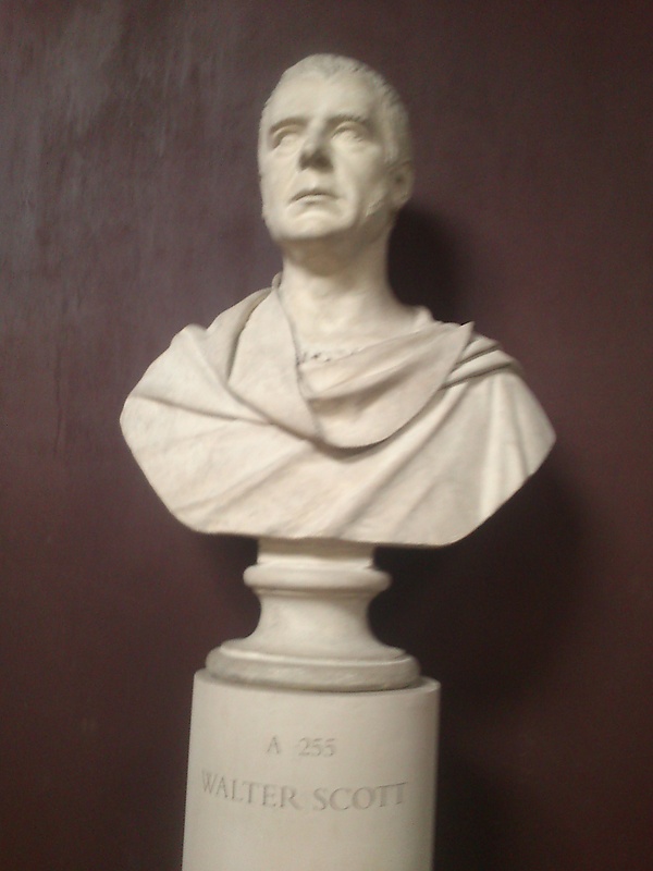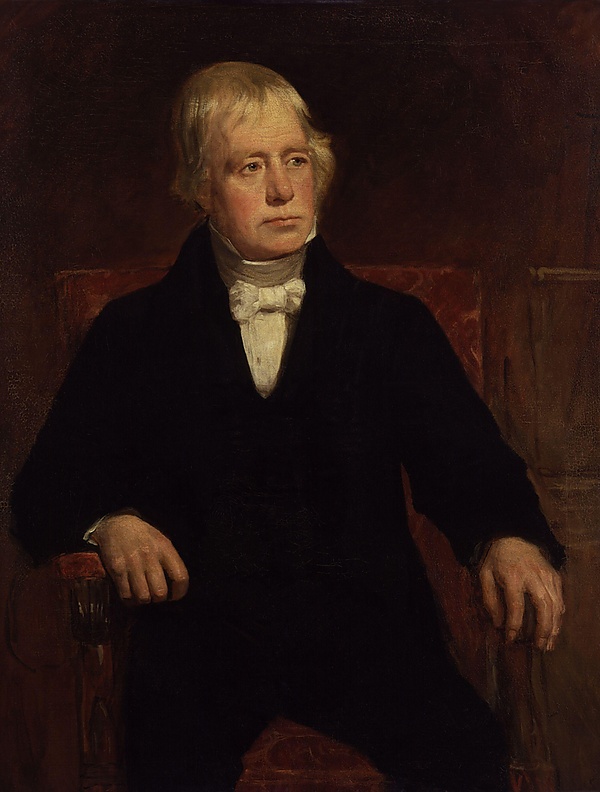 Сэр Ва́льтер[9] Скотт, 1-й баронет (англ. Walter Scott, /ˈwɔːltə skɒt/; 15 августа 1771, Эдинбург — 21 сентября 1832, Эбботсфорд, похоронен в Драйбургском аббатстве) — шотландский прозаик, поэт, историк, собиратель древностей, адвокат и драматург[10]. Основоположник жанра исторического романа. Многие из его произведений остаются классикой европейской и шотландской литературы, в частности романы «Айвенго» (1819 г.), «Роб Рой» (1817 г.), «Уэверли» (1814 г.), «Пуритане » (1816 г.), «Эдинбургская темница» (1818 г.) и «Ламмермурская невеста» (1819 г.), а также поэмы «Мармион» (1808 г.) и «Дева озера» (1810 г.). Он оказал большое влияние на европейскую и американскую литературу. Как адвокат, судья и юридический администратор, он совмещал свою повседневную работу в качестве секретаря заседания и заместителя шерифа Селкиркшира, с литературным творчеством. Вальтер Скотт занимал видное место в эдинбургском обществе, он активно работал в Хайлендском обществе, долгое время был президентом Эдинбургского королевского общества (1820–1832) и вице-президентом Общества антикваров Шотландии (1827–1829). Его знание истории и литературные способности позволили ему установить жанр исторического романа как образец европейского романтизма. Он стал баронетом Эбботсфорда в графстве Роксбургшир, Шотландия, 22 апреля 1820 года; титул упразднён после смерти его сына в 1847 году.