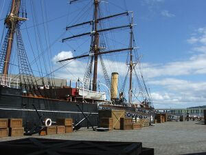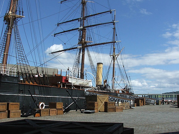 Экспедиционное судно получило название «Дискавери» («Открытие») в честь корабля Дж. Кука. Это был последний в истории британского судостроения деревянный трёхмачтовый барк и первое английское судно, специально предназначенное для научных исследований[23]. Спуск на воду прошёл 21 марта 1901 года, церемонию освящения провела леди Маркэм[24]. Корпус был деревянным, способным выдерживать напор льдов, толщина борта достигала 66 сантиметров, толщина таранного форштевня — несколько футов, он был окован стальными листами. Винт и руль могли подниматься из воды в случае попадания в лёд.