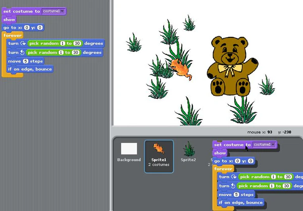 Для программирования сценариев в Скретче используется drag-and-drop-подход: блоки из палитры блоков перетаскиваются в область скриптов.