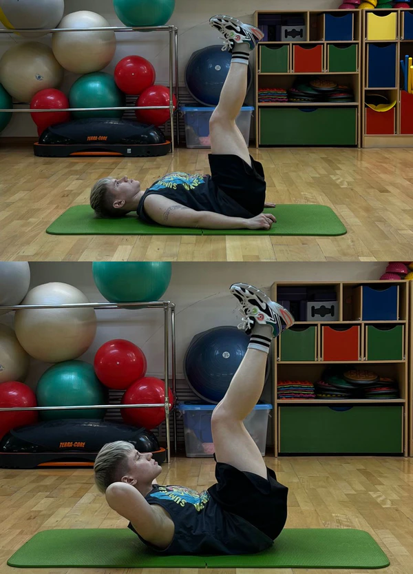 Необходимо лечь на спину, поясницу плотно прижать, ноги согнуть в коленях под углом 90 градусов и поднять перпендикулярно корпусу, руки завести за голову.