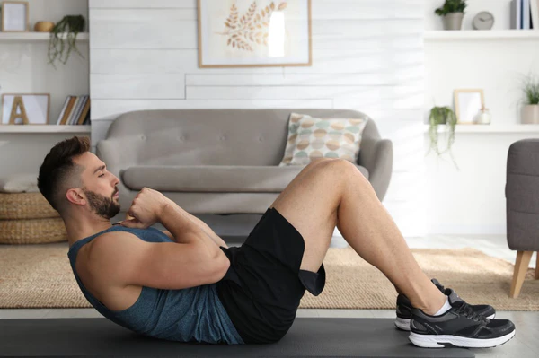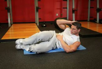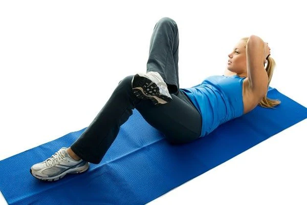 Необходимо лечь на спину, согнув ноги в коленях, поясницу плотно прижать к полу, руки завести за голову или сложить на груди[2].