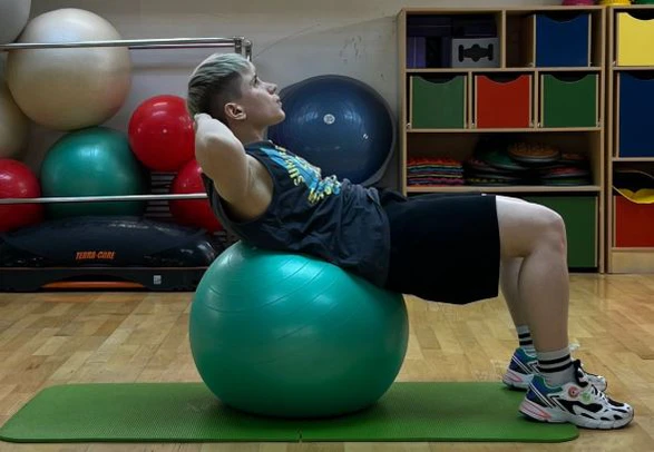 Необходимо лечь на фитбол так, чтобы поясница и спина лежат на поверхности мяча[4].