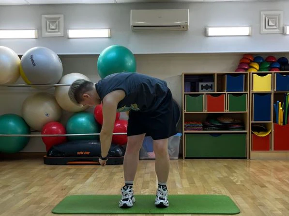 На выходе наклониться вниз и по диагонали, рукой нужно коснуться противоположной ноги.
