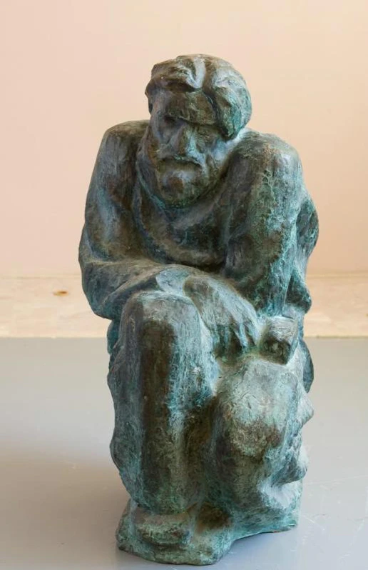 Скульптура изображает мужчину крепкого телосложения с окладистой бородой средней длины. Фигура представлена в положении низкой посадки. Мужчина скрещивает руки, опираясь о правое колено. В правой руке он держит орудие скульптора. Черты лица выполнены строго: прямой нос, ровный открытый лоб, тяжело нависшие надбровные дуги и резко очерченные скулы. Эти элементы подчёркивают состояние глубокого раздумья персонажа.