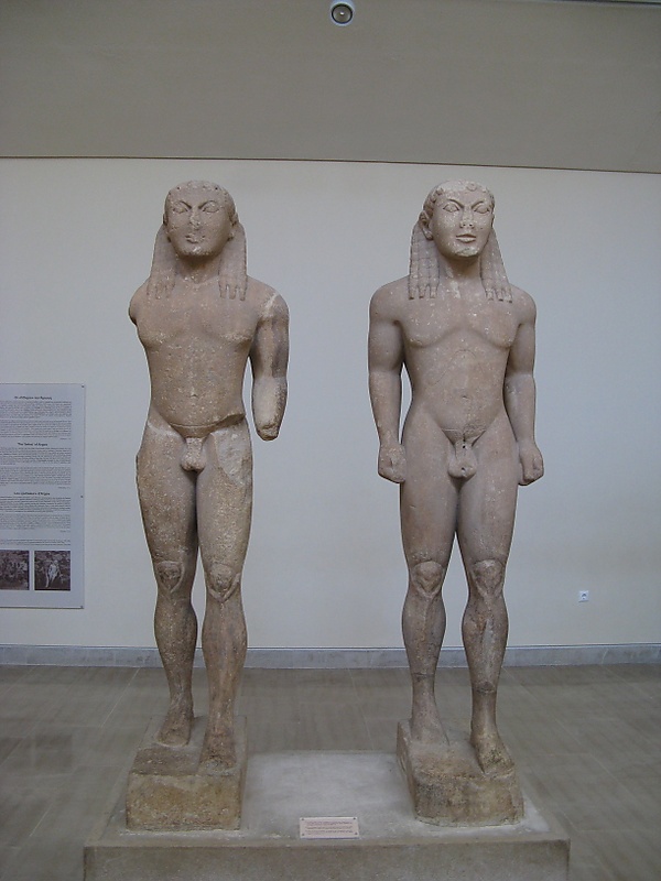 Ярким примером мужских изображений является скульптурная группа Клеобис и Битон, созданная на рубеже VII—VI веков Полимедом Аргосским. Хотя само по себе решение группы в виде двух почти одинаковых статуй показывает ещё ограниченность приемов архаики, созданный скульптором образ двух легендарных героев ярко выражает идеал дорического искусства Аттики. Тяжеловесные объёмы тел суровы, в них четко выявлены тектонические членения. К аттическим куросам относятся так же статуя с мыса Сунион ок. 600 года (Афины, Национальный музей) и статуя конца VII века (Нью-Йорк, Метрополитен-музей).