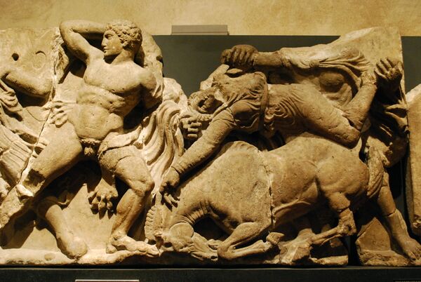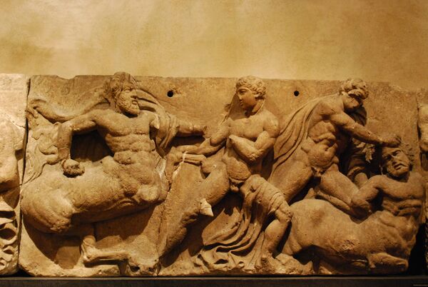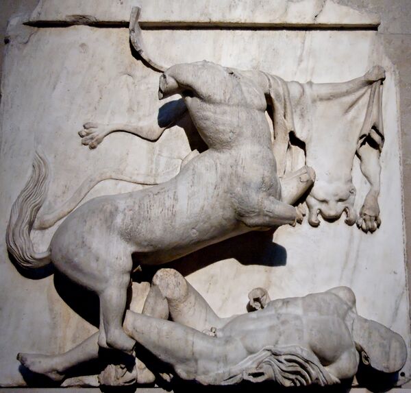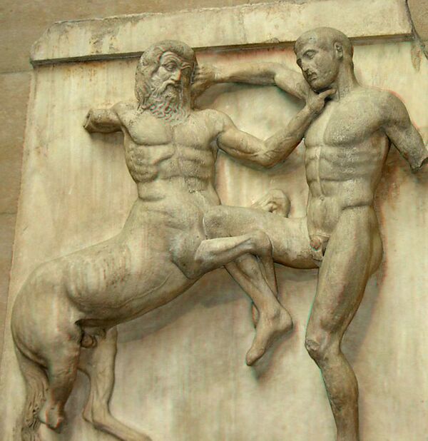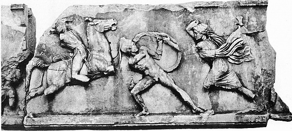 Метопы также были посвящены мифической истории Аттики: битве греков с амазонками, осадившими Афины, кентавромахии, взятию Илиона, то есть Трои. До нашего времени более-менее целыми дошли южные метопы со сценами кентавромахии. Каждая из них обладает законченной композицией, изображающей различные моменты борьбы, в которой побеждает то кентавр, то человек. Но, таким образом, все вместе метопы создают общую картину битвы. Над метопами работали разные, обладавшие различными почерками мастера.
