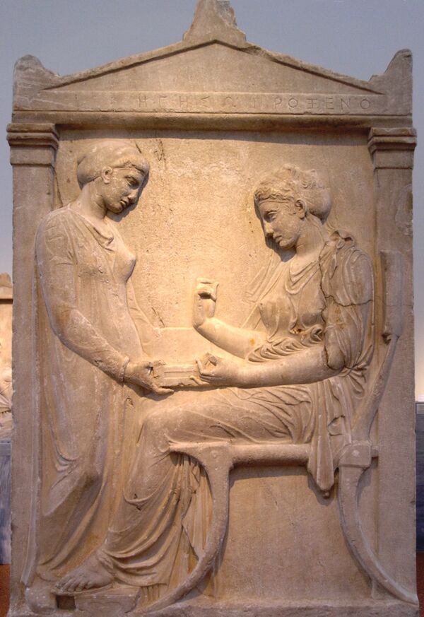 В технике невысокого рельефа скульптором Аристоклом создана и стела Аристиона ок. 510 года (Афины, Национальный музей). В ней особый созерцательный настрой, так подходящий для мемориального изображения, предвосхищает образы надгробных стелл периода классики[2].