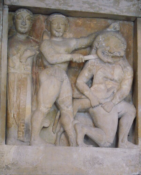 Одновременно развивается и монументальная скульптура, оформляющая архитектурные постройки. Здесь важнейшую роль играет рельеф, дающий по сравнению со статуями более широкие возможности для повествовательных композиций на мифологические темы. Ранним примером решения композиции фронтона является скульптура храма Артемиды в Керкире ок. 590 года до н. э. (Керкира, музей.) Здесь изображен миф о Медузе-Горгоне и Персее. Фигура Медузы-Горгоны изображена в крупном масштабе в центре фронтона в позе коленопреклоненного бега. Рядом с ней крошечная фигурка Персея, вносящая в композицию асимметрию. По сторонам от центральной группы изображены лежащие львы, а в углах фронтона крошечные по размеру сцены, одна из которых представляет Зевса убивающего гиганта.