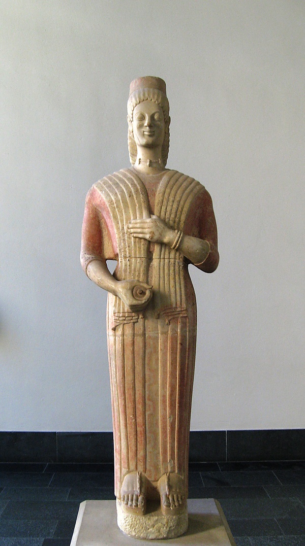 К числу хорошо сохранившихся женских фигур относится «Богиня с гранатом» из Кератеи 580—570 годов (Берлин, Государственные музеи), сохранившая даже первоначальную яркую раскраску, «Богиня с зайцем» из Герайона близ Тигани на острове Самос ок. 560 года (Берлин, Государственные музеи) и др. Нижняя часть последней статуи трактуется уже не как простой столбообразный объём, в ней проявляется естественная пластика тела. Жест поднятой руки разрушает строгую неподвижную симметрию.
