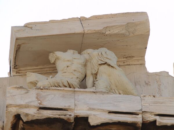 Другим интересным примером решения композиции фронтонов является скульптура Гекатомпедона — древнейшего храма Афинского Акрополя, созданная ок. 570 года.