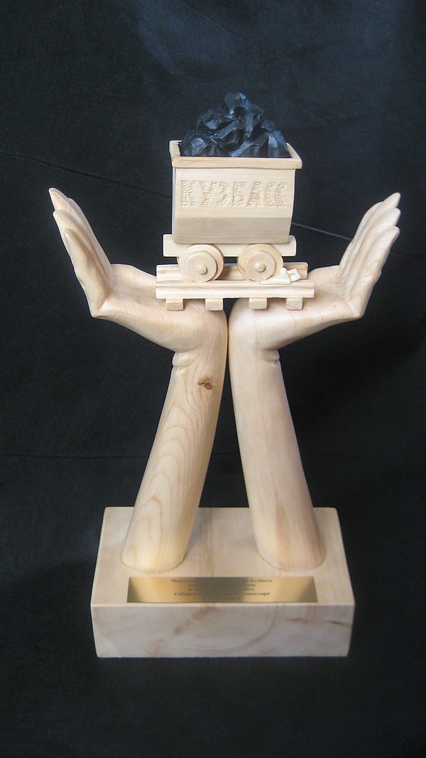 Скульптура вырезана из кедра. Основание выполнено в прямоугольной форме. На основании изображены две руки, держащие вагонетку. На вагонетке нанесена надпись «КУЗБАСС», а уголь окрашен в чёрный цвет. На боковой грани основания присутствует авторская подпись «L. Усов – 2014». В передней части основания прикреплена шильда из жёлтого металла с дарственной надписью: «Многоуважаемому губернатору Кузбасса // Аману Гумировичу Тулееву // в честь Дня шахтёра-2014. // Сибирское управление Ростехнадзора // Е. Л. Резников».