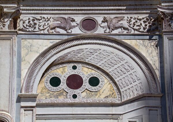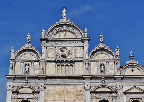Однако самое замечательное — перспективные рельефы-обманки нижнего яруса фасада с мраморной инкрустацией: попарные изображения архитектурных порталов, будто уходящих в глубину, а на самом деле неглубокого рельефа, с изображениями «марчианских львов» (Leoni marciani) и истории Святого Марка (storie di San Marco). Эта работа приписывается мастерской Пьетро Ломбардо. Асимметрия фасада отражена во внутренней планировке: правая часть здания (с собственным входом) была отведена под приют (Albergo), в левой размещалась капелла[4].