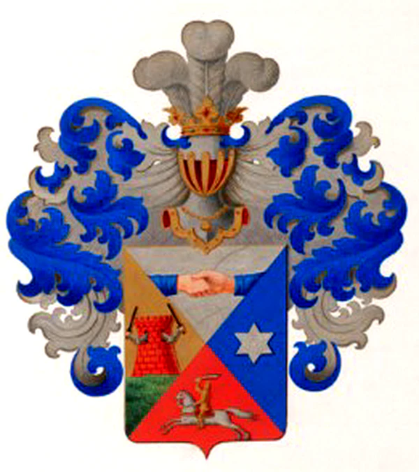 Щит скошенно-четырёхчастный. В первой, серебряной части, две сложенные руки, в лазоревой одежде. Во второй, золотой части, на зелёном холме, червлёная башня, с двумя такими же окнами, из которых выходят две в серебряных латах руки, держащие чёрные мечи. В третьей, лазоревой части, серебряная о шести лучах звезда. В четвёртой, червлёной части, в золотых латах, с серебряным подъятым выгнутым мечом, воин, скачущий на серебряном коне, покрытом червлёным ковром.