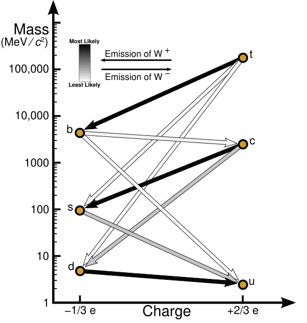 Аналогично, даун-тип кварк (d, s, b, заряд −1/3) может стать ап-типом кварком (u, c, t, заряд +2/3) с испусканием W−-бозона или поглощением W+, с вероятностями, определяемыми матрицей ККМ. Обратно, ап-тип кварк может превратиться в даун-тип с помощью обмена W-бозонами:
