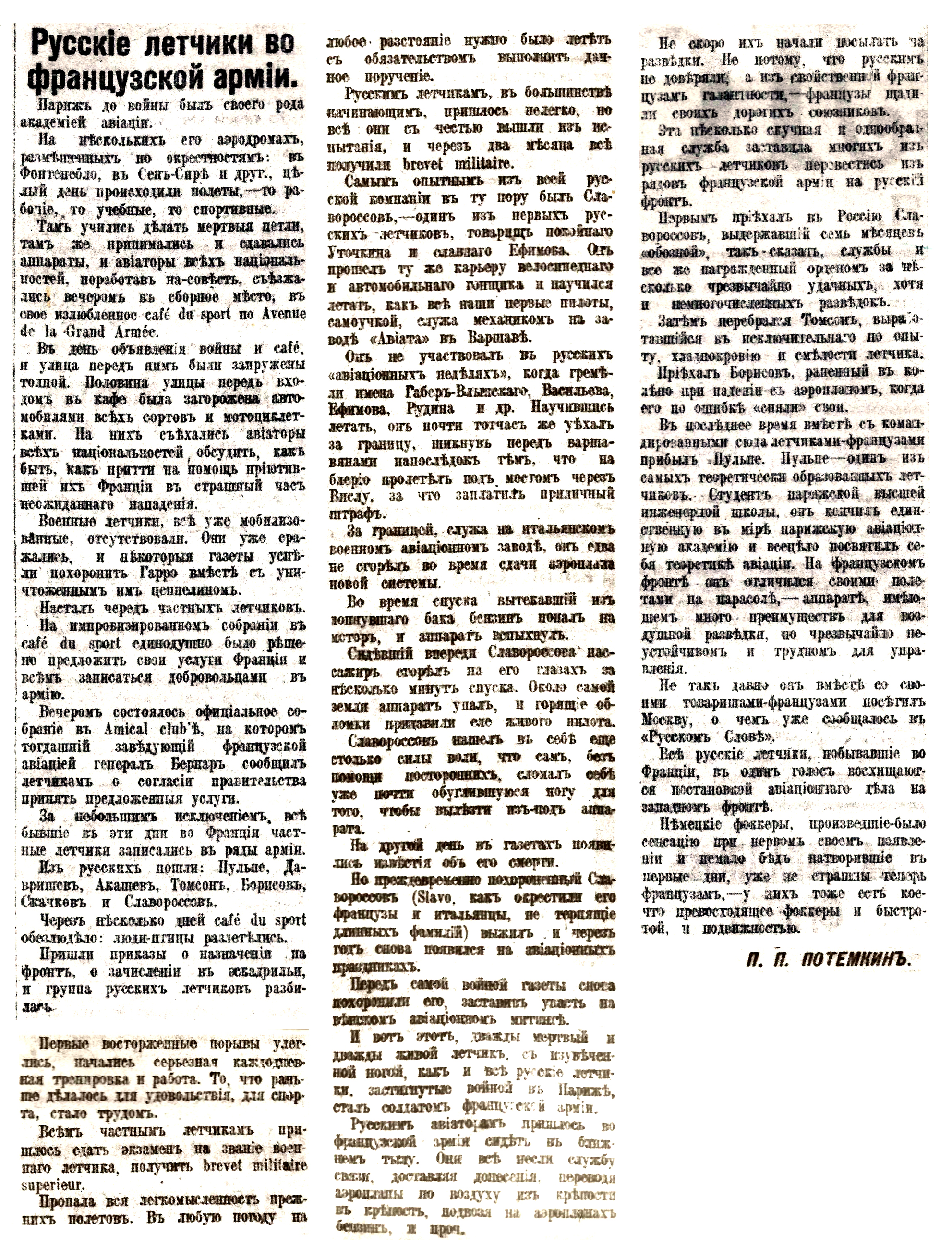 - Потемкин П.П. Русскіе лётчики во французской арміи. — Русское слово, 6 июня 1916 года.