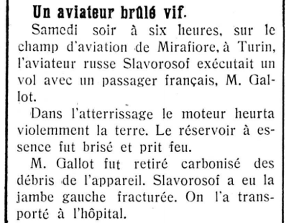 «6 апреля в 6 часов вечера на военном аэродроме Мирафиори во время полёта русского авиатора Славороссова с пассажиром Гало внезапно произошел взрыв мотора. Пассажир сгорел, умирающий авиатор в госпитале».