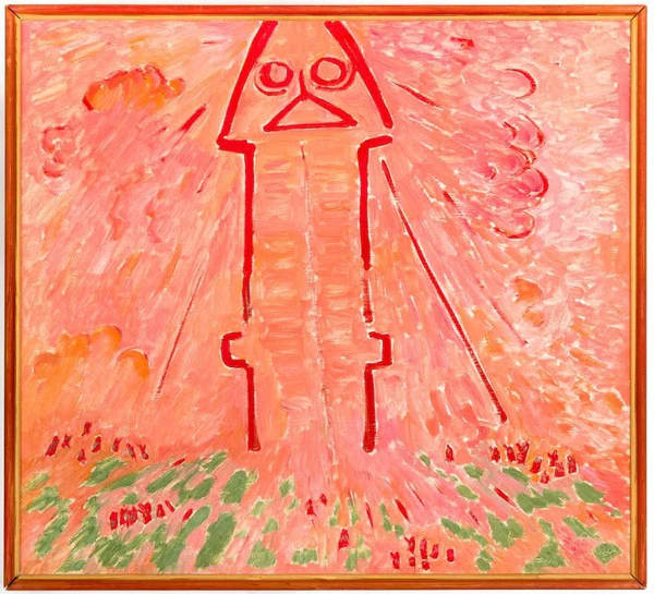 На полотне представлено условное изображение славянского божества Ярило, олицетворяющего солнце и плодородие в славянской мифологии. На переднем плане изображены отдельные группы людей, которые с помощью натянутых тросов, отмеченных длинными красными линиями, пытаются поднять или установить массивную скульптуру Ярило. Фигура божества напоминает устремлённую вверх стрелу. На переднем плане широкими короткими мазками зелёного цвета изображена трава.