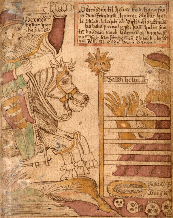 В главе 49, Высокий описывает смерть Бальдра. Хермод Удалой, сын Одина, согласился ехать к Хель, чтобы предложить выкуп за возвращение Бальдра. «Вывели тут Слейпнира, коня Одина, вскочил Хермод на того коня и умчался прочь». Хермод ехал девять ночей по широким, тёмным долинам, где ничего не мог разглядеть, пока не подъехал к реке Гьёлль и не ступил на мост, выстланный светящимся золотом. Там он встретил деву по имени Модгуд, охранявшую мост. Во время разговора с Хермодом Модгуд отмечает, что под ним одним мост грохочет не меньше, чем под пятью полчищами мёртвых, которые проезжали через мост на днях. Слейпнир и Хермод отправились «вниз и к северу» по дороге в Хельхейм, пока вдвоём не приблизились к воротам в Хельхейм. Хермод спешился со Слейпнира, затянул его подпругу, а затем снова оседлал его и пришпорил. Слейпнир перескочил через ворота, да так высоко, что вовсе их не задел. Хермод подъехал к палатам и слёз со Слейпнира. Просьба Хермода к Хель о возвращении Бальдра была принята с определёнными условиями и Хермод отправился обратно в Асгард; Бальдр проводил его из палат.
