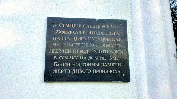 23 февраля 1944 года[5] на станцию Слепцовская насильственно сгоняли ингушей и в товарных вагонах оправляли в ссылку в Казахстан и Среднюю Азию. В память об этом преступлении на стене здания вокзала установлена памятная табличка.
