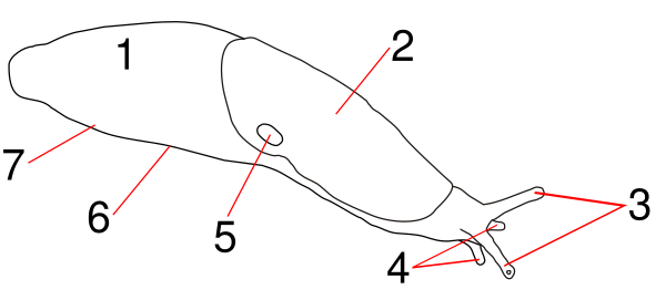Как и у других брюхоногих, в теле слизней выделяют три отдела: голову, ногу и висцеральную массу. Последняя, ввиду отсутствия раковины, образует не внутренностный мешок, а распластанный по спинной стороне ноги нотум (лат. notum — спина). На голове расположены сократимые щупальца (одна или две пары), на которых располагаются органы чувств (развитые глаза, органы тактильного и химического чувства). Позади головы на спинной стороне находится мантия с непарным лёгочным отверстием (пневмостомом), ведущим в мантийную полость, которая функционирует как лёгкое. Рядом с пневмостомом располагается анальное отверстие.