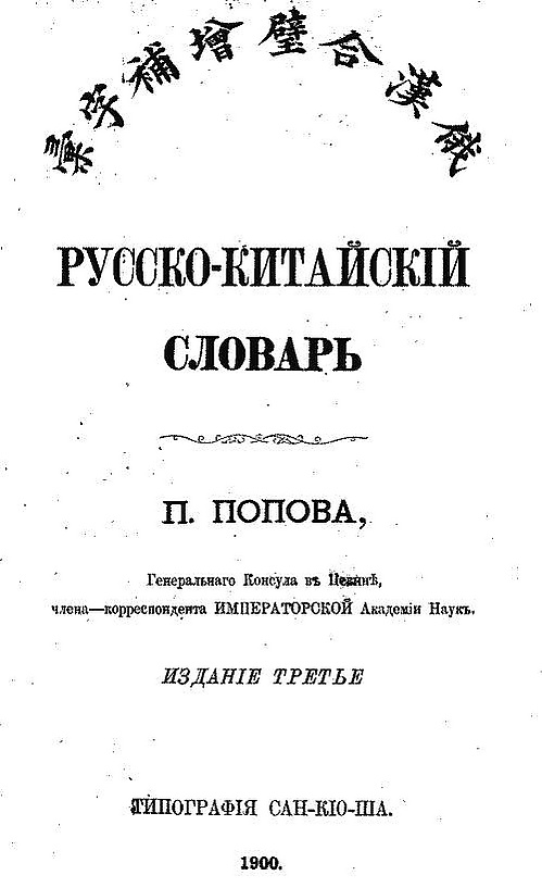 - Русско-китайский словарь П. С. Попова (первое издание 1888; второе переработанное 1896; третье 1900)