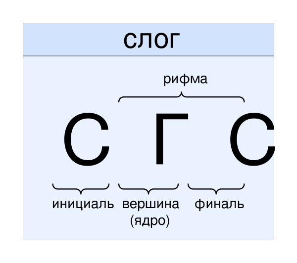Cогласные в начале слога называются инициалью, согласные в конце слога называют финалью, а слогообразующий звук в середине называется ядром или вершиной. Ядро и финаль вместе взятые называются рифмой[* 2].