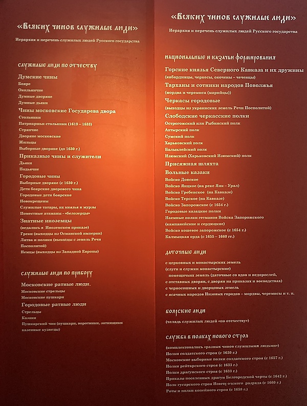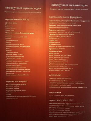 К служилым людям «по отечеству» (юридически привилегированный класс) относились чины и разряды[13]: