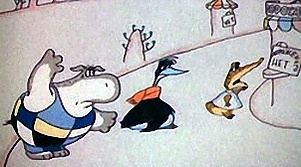 Бегемот и его приятель Пингвин приходят на представление в театр. Собака ездит на моноцикле и жонглирует кольцами, хамелеон — иллюзионист, показывает завораживающие фокусы, страусы потрясающе танцуют чечётку. Зрители бросают на арену цветы. Представление так поражает воображение Бегемота, что он решает выступить сам, со своим номером, без всякой подготовки. Бегемот в пляске ломает декорации на арене, приводит публику в ужас. Зал стремительно пустеет. Зрители разбегаются. От обиды бегемот топает и разносит всё здание цирка.