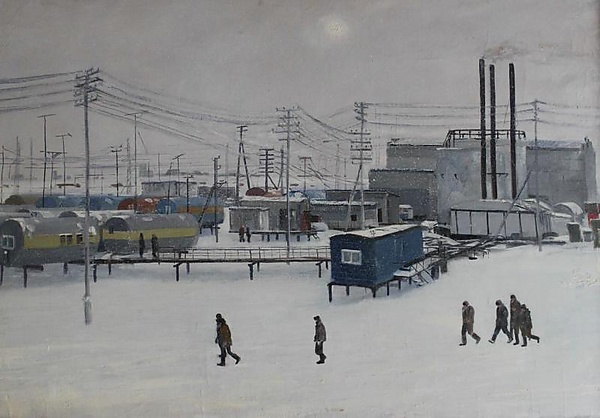 На картине представлен индустриальный пейзаж: в заснеженной местности расположены дома-вагончики, между которыми протянуты линии электропередач. На переднем плане изображены люди, выходящие от вагончиков, что придаёт сцене жанровую насыщенность. На заднем плане, слева, выделяются синий вагончик, комплекс металлических строений и три дымящиеся трубы. В небе тускло светит солнце, подчёркивая атмосферу зимнего дня.