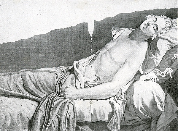 «Народ обращался к моему искусству, желая вновь увидеть черты своего друга… Я услышал голос народа, я повиновался ему. — Спешите все! Мать, вдова, сирота, угнетённый солдат, все вы, кого Марат защищал до конца своей жизни, приблизьтесь! И посмотрите на своего друга. Того, кто стоял на страже, уже нет. Его перо, ужас изменников, выпадает из его рук. О, горе! Ваш неутомимый друг мёртв!»[2]