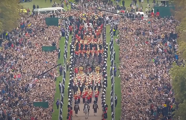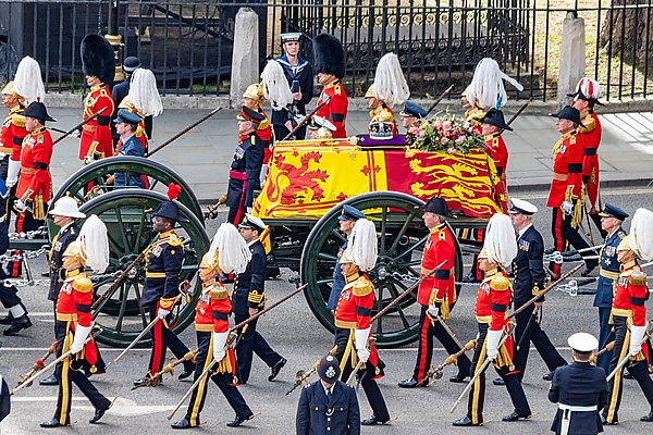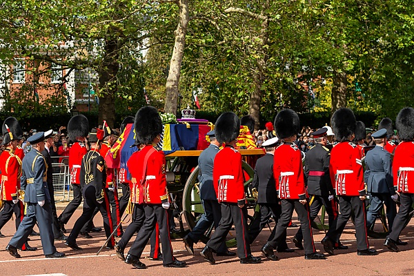 14 сентября гроб Елизаветы II доставили в Вестминстерский дворец на лафете королевской конной артиллерии, запряжённом лошадьми. Карл III и другие члены королевской семьи следовали за гробом пешком[82][83]. Процессия, как и последующие траурные шествия в Лондоне и Виндзоре, маршировала в темпе 75 шагов в минуту в сопровождении военного оркестра, исполнявшего марши Людвига ван Бетховена, Феликса Мендельсона и Фредерика Шопена[82][84]. Биг-Бен звонил один раз в минуту, а в Гайд-парке королевская конная артиллерия производила выстрелы из пушек[85]. Представители трёх основных родов войск королевства выстроились в почётный караул на Парламентской площади, после чего солдаты королевской роты 1-го батальона Гренадерского гвардейского полка поместили гроб на катафалк в Вестминстерском холле[82]. Затем архиепископ Кентерберийский Джастин Уэлби и настоятель Вестминстерского аббатства Дэвид Хойл провели службу в присутствии короля и членов монаршей семьи[86].