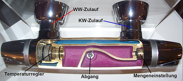 Термостатический смесител (термостатирующий смеситель, смеситель-термостат) — это устройство, предназначенное для автоматического поддержания заданной температуры воды. Бытовые смесители-термостаты имеют две рукоятки-регулятора: одной регулируют напор воды, а другой температуру. Устройство термостата аналогично устройству широко распространенных восковых термостато автомобильных двигателей: в герметичной капсуле находится специальное вещество (воск), плавящееся в диапазоне температур регулировки термостата. При плавлении вещество расширяется, приводя в движение арматуру, регулирующую соотношение горячей и холодной воды. Рукояткой регулировки температуры пользователь меняет давление в капсуле, что в некоторых пределах меняет температуру плавления вещества в ней. Регулятор потока ставят после термостатирующего узла, управляя потоком смешанной теплой воды. Смесители-термостаты нуждаются в специальных обратных клапанах, предотвращающих перетекание воды между горячей и холодной трубами. Обычно такие клапаны встроены в смеситель.