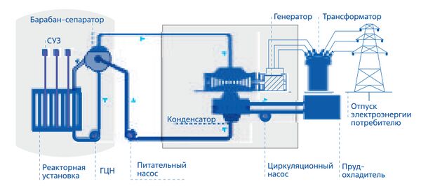 Пар в одноконтурных реакторах РБМК-1000 образуется непосредственно в реакторе из воды, предназначенной для охлаждения реактора. Для работы одного энергоблока используется два турбогенератора, установленных в общем для всех трёх энергоблоков машинном зале. Цепная ядерная реакция происходит в активной зоне реактора, а получаемое в результате реакции тепло затем преобразуется в электроэнергию[10].