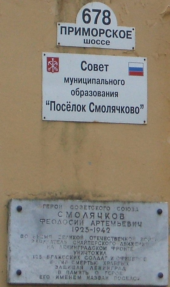 Назван в 1948 году в честь Героя Советского Союза снайпера Феодосия Смолячкова, погибшего под Пулково в 1942 году. До этого — деревня Лаутаранта (часть деревни Ино), Инонкуля — название переводится как «Досочный берег», возможно здесь, когда-то был склад с досками[3].