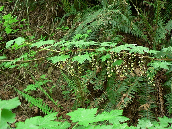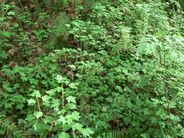 Листья 3—6 см в диаметре, с сердцевидным основанием, 5—7-лопастные с острыми, узкоромбовидными лопастями. Листовая пластинка с обеих сторон голая или почти голая. Края листа острозубчатый.