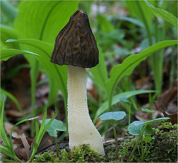 - Сморчок конический (Morchella conica): шляпка конической формы, также сросшаяся с ножкой по краю.