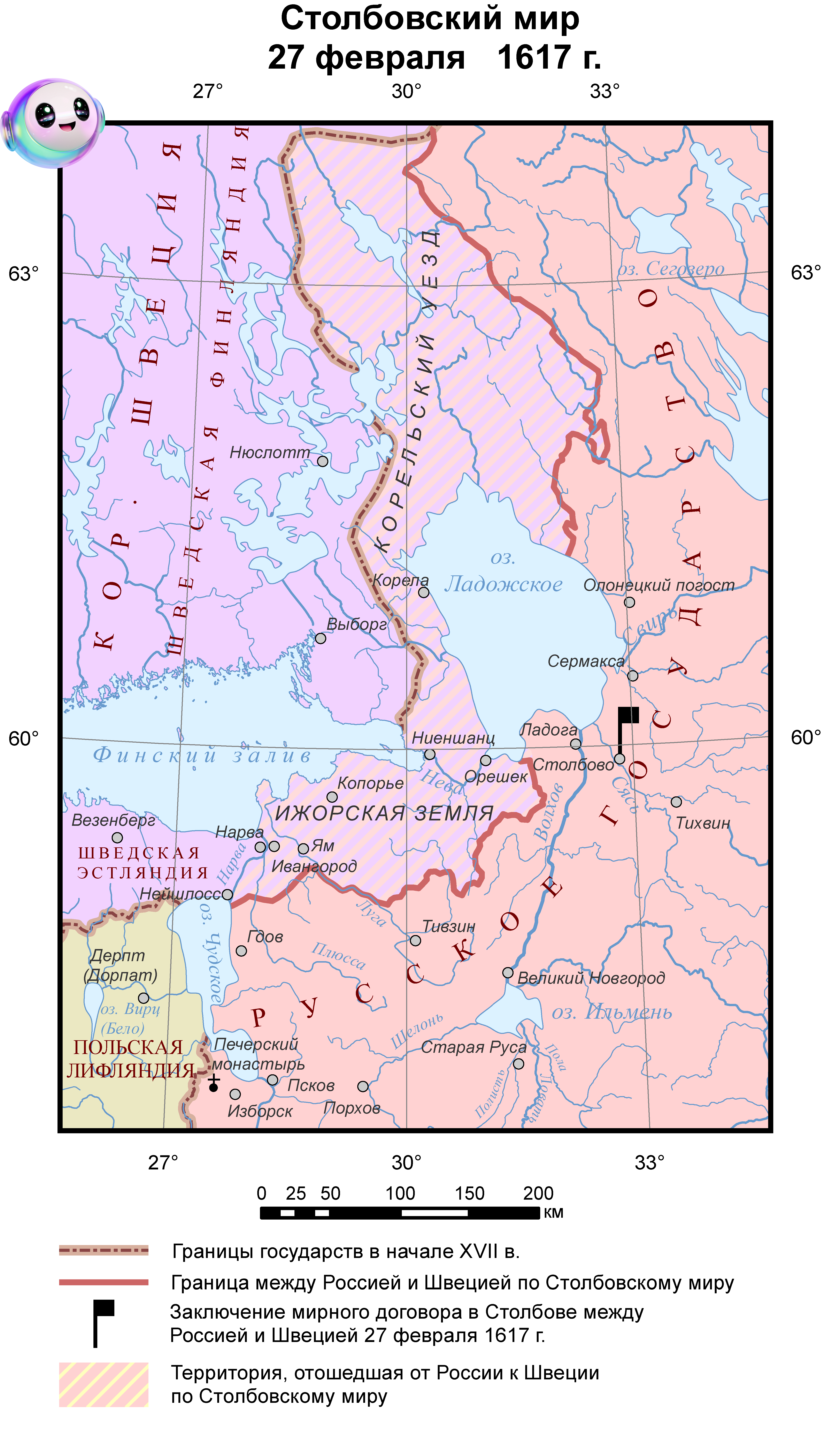 5 (15) декабря 1615 года, после серии дипломатических контактов, Русское царство и Швеция при посредничестве Англии заключили перемирие и приступили к мирным переговорам. 27 февраля (9 марта) 1617 года был подписан Столбовский мирный договор. Русское царство потеряло Ижорскую землю и Корельский уезд, лишилось выхода к Балтийскому морю, но вернуло себе Новгород, Порхов, Старую Руссу, Ладогу и Гдов. Москва должна была выплатить 20 тысяч рублей. Стокгольм разрешал дворянам и посадским людям (но не крестьянам) свободно покинуть полученные Швецией территории в течение двух недель после подписания соглашения. Царь Михаил Фёдорович отказался от претензий на Ливонию и Корелу, а шведские принцы — от притязаний на русский трон[227][207][228]. Столбовский мир позволил Русскому царству освободить все силы для борьбы с польско-литовскими оккупантами[229].