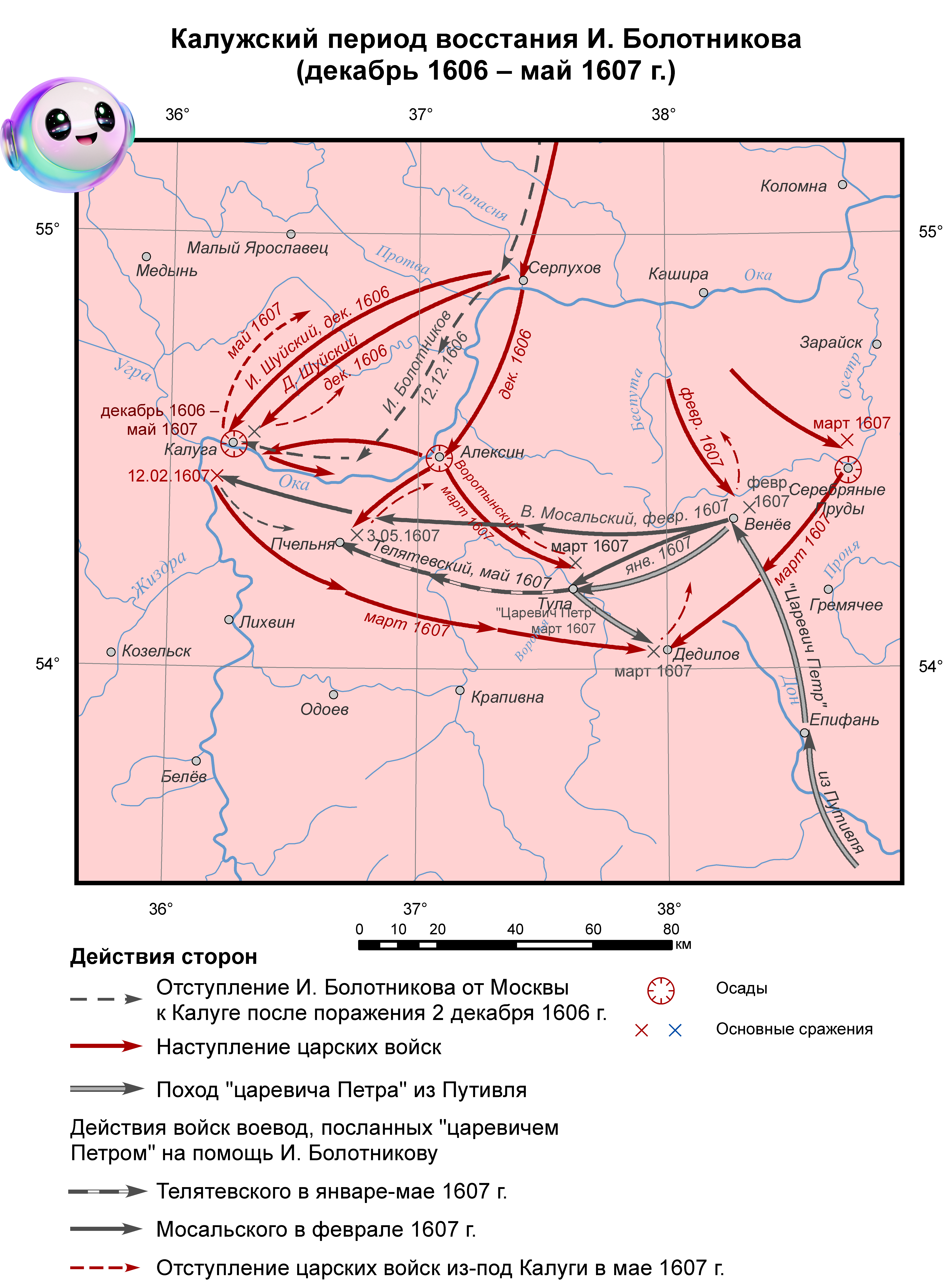 30 декабря 1606 года (9 января 1607 года) царское войско осадило Калугу, но 3 (13) мая 1607 года, в свою очередь, потерпело поражение от восставших во главе с бывшим хозяином И. И. Болотникова — князем А. А. Телятевским — в битве на Пчельне[82]. Осада Калуги была снята, причём пушки осаждавших и обоз с припасами достался И. И. Болотникову. В мае 1607 года он вышел из Калуги в Тулу[84].