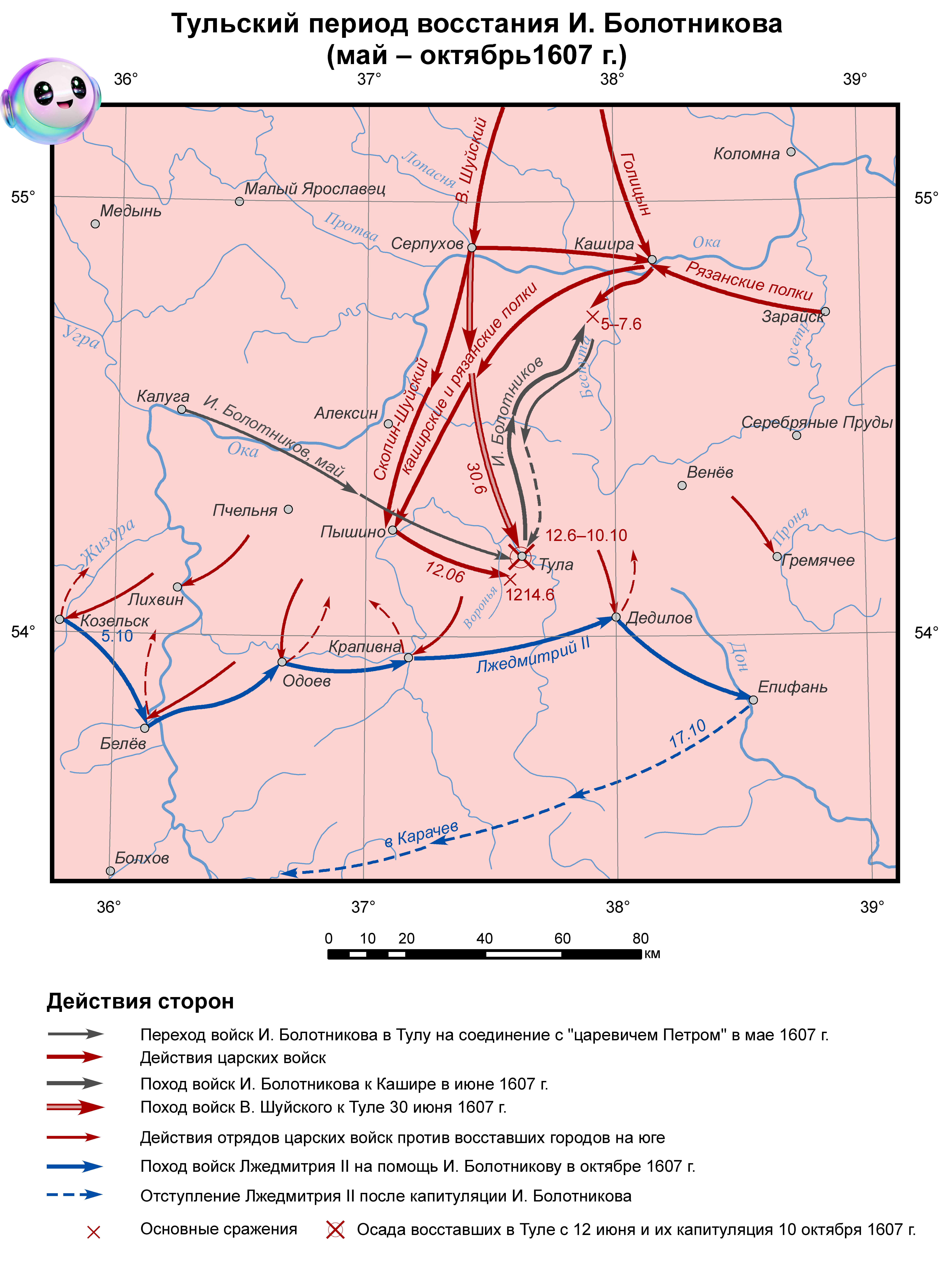 В мае 1607 года царь Василий лично возглавил поход на Тулу. Обе стороны направили сильные отряды занять Каширу, которая контролировала переправу через Оку и обеспечивала прямой путь к Москве. В битве на Восьме 5 (15) — 7 (17) июня 1607 года войска И. И. Болотникова были разбиты[89].