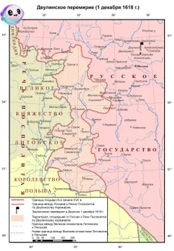 1 (11) декабря 1618 года Русское царство и Речь Посполитая заключили Деулинское перемирие. К Польше отходили Северская, Смоленская и Черниговская земли. Более того, королевич Владислав не отказывался от претензий на царский трон, тогда как царь Михаил был вынужден отказаться от титулов правителя Ливонии, Смоленской и Черниговской земель. Стороны обменялись пленными. В июне 1619 года на родину вернулся отец царя — митрополит ростовский Филарет[244][2][207].